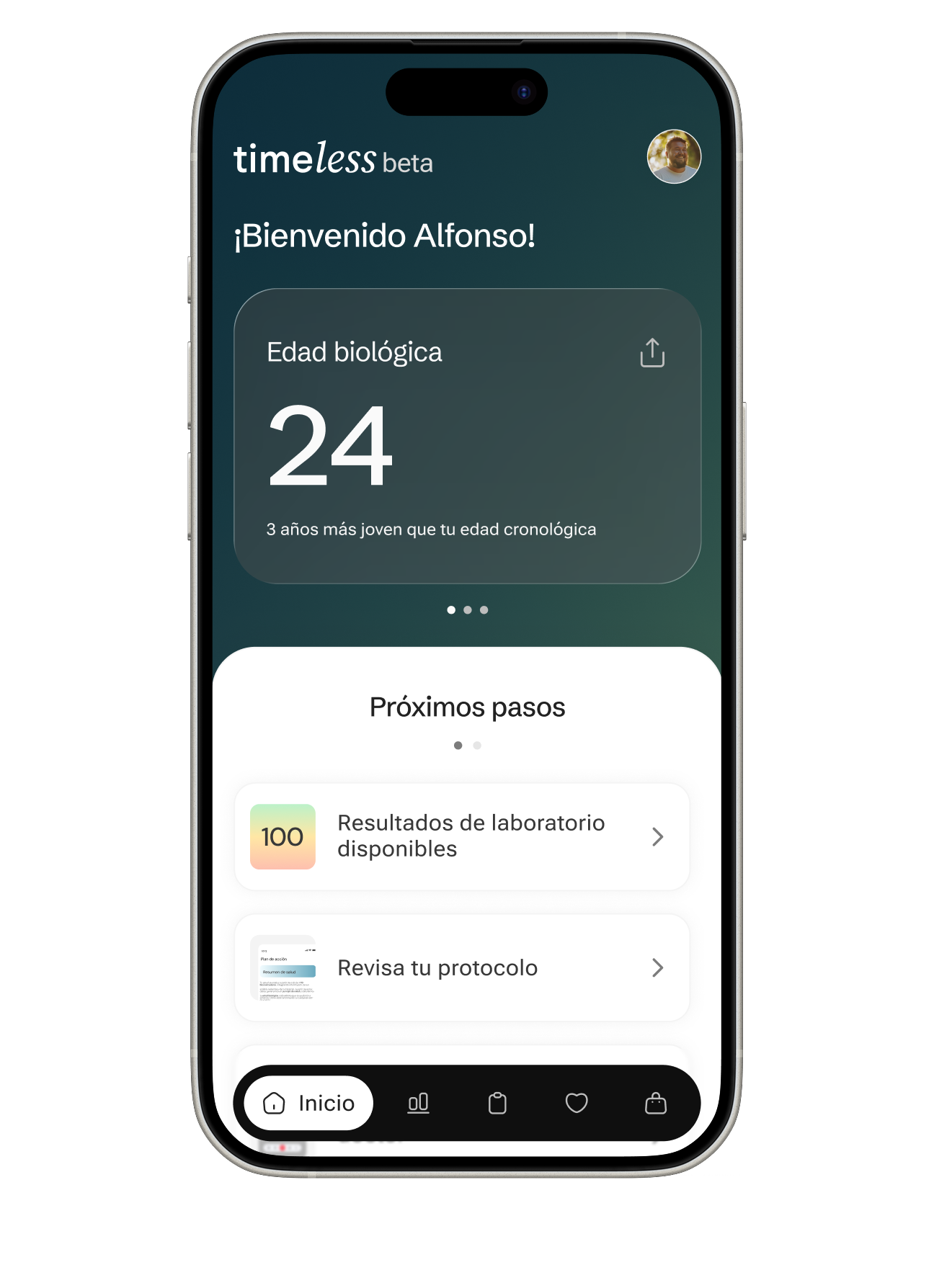 Lo que funciona para unos no funciona para todos. Timeless diseña protocolos para optimizar tu salud que responden y se adaptan a la individualidad de tu cuerpo y tu contexto.